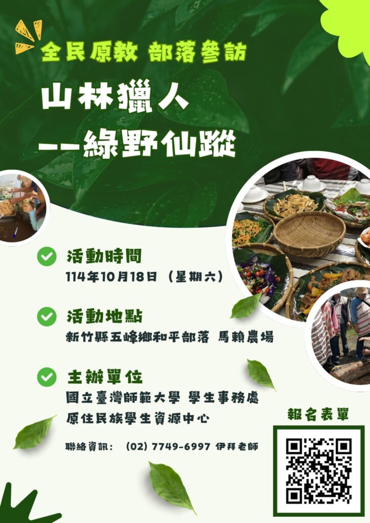 News Let Indigenous Voices Be Heard — The 30th Northern Taiwan Intercollegiate Indigenous Language Singing Contest, “Nasi: Voice・Life,” is now accepting registrations. October 30, 2025 Read More NTNU Indigenous Student Resource Center Visits Heping Village in Hsinchu Experiencing Atayal Culture and Sustainable Tourism October 20, 2025 Read More 2025 Indigenous Rituals in Taiwan – Photography Works Submission October 20, 2025 Read More 2025 NTNU LIMA Cup – Indigenous Student Games, 5th Edition! October 13, 2025 Read More National Indigenous Education Lecture Series: Clan Subjectivity and Bunun Cultural Heritage October 7, 2025 Read More Normal University Launches “Sunshine Financial Relief Program” to Support Students in Guangfu, Hualien. September 30, 2025 Read More Maefer Indigenous Performing Arts Workshop September 26, 2025 Read More Indigenous Education for All Tribal Visit Event: Micro Tribal Industry Tour – A Hunter’s Wilderness Experience September 18, 2025 Read More